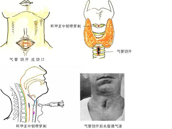 2、在环状软骨与甲状软骨之间正中处可触到一凹陷,即环甲膜,此处仅为一层薄膜,与呼吸道相通,为穿刺位置。
