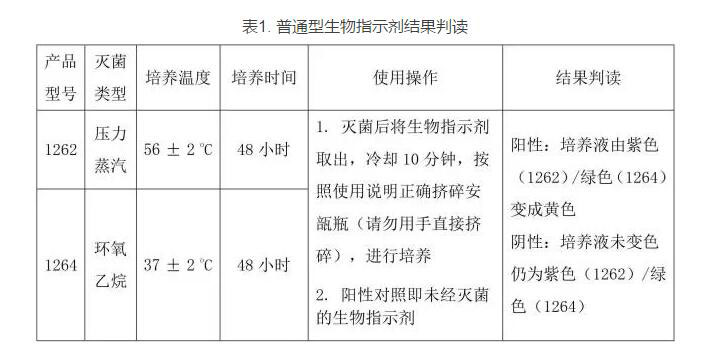 1. 自含式普通型生物指示剂,内含有高抗力的芽孢。芽孢在复苏、增值过程中,会产生酸性代谢产物,由于培养基中含有pH敏感的染料,在酸性条件下就会变成黄色。自含式普通型生物指示剂的结果判读见附表1,在培养过程中必须设置阳性对照,即未经灭菌暴露的生物指示剂。设置阳性对照的意义在于确保培养条件和芽孢的发育能力正常,只有阳性对照为阳性,生物监测的结果才是有效的。