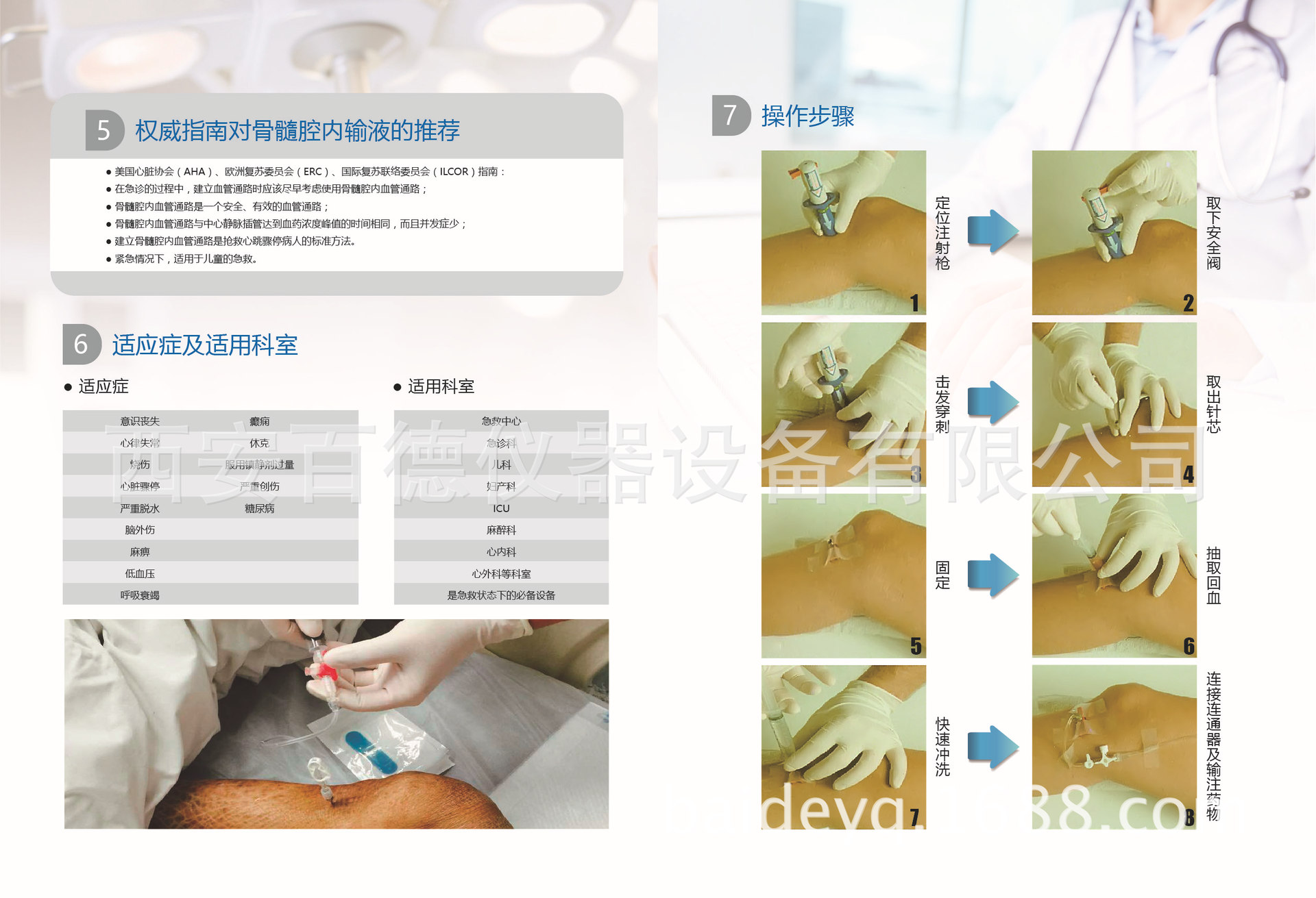 这是一个专门为急诊医学量身定做的一个装置。主要功能是迅速安全的建立输液通道,提高抢救的成功率。美国心脏学会规定,复苏时静脉穿刺3次失败或时间超过90 s,即为建立骨髓通路指征。操作简单,可在30 s内完成;解剖标志易于识别,穿刺成功率高,被誉为不萎陷的静脉。