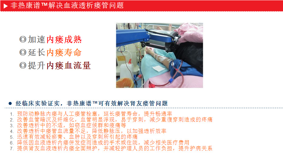 瘘管阻塞是过去医疗界所无法克服的问题,以往经常会使用热敷来进行预防,但成效有限,且有感染及烫伤的疑虑。而非热康谱却突破了洗肾瘘管狭窄化这项医学瓶颈,给患者一个全新的选择。